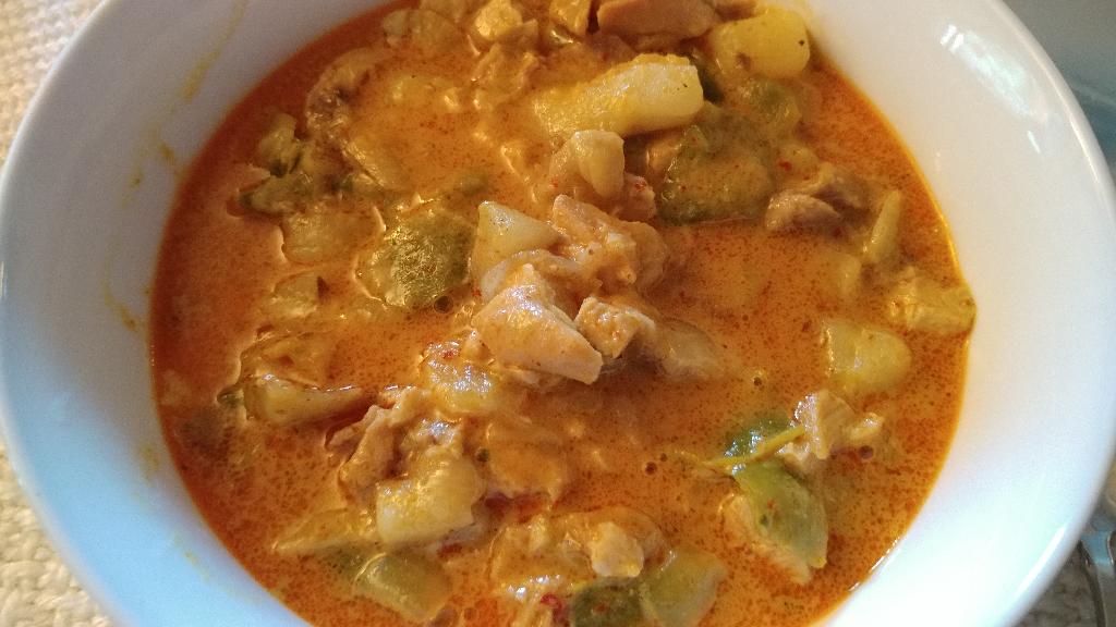A finished huge bowl of yellow curry made with Maesri yellow (Karee) curry