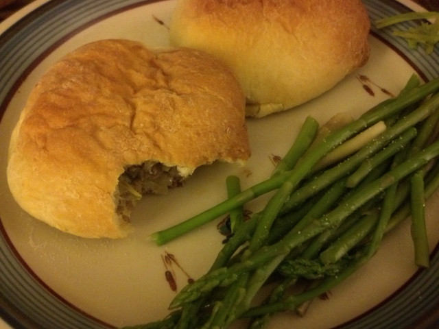 Cut dough into manageable sections and roll out on lightly floured surface (or unfloured on a dough sheet.) Roll thin using rolling pin. Cut dough into pieces (whatever size you like, about 4" square is good). Roll out again with a rolling pin for efficient use of your dough! Fill with a couple heaping spoonfuls of filling. Fold corners of dough together, pinch closed (I find 8 to 10 little pinches is good), and turn over with seam down on cookie sheet. Bake in oven for 10-12 minutes or until golden. Cool on rack. Can freeze after cooled. These reheat very nicely in the microwave.