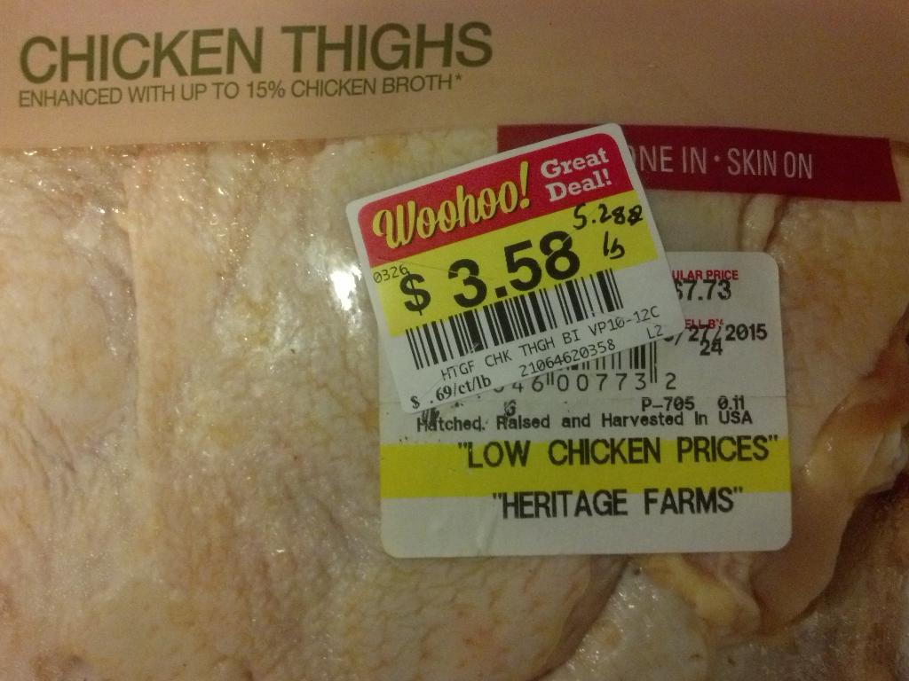 Woohoo! Expired meats! Okay, they weren't expired at all, but rather put on even deeper discount because the "sell by" date was the next day. The price was $3.58 for almost 5.3 pounds of chicken thighs; this is $0.68 / lb, the cheapest meat I've found so far! And that includes bologna or hot dogs! That's only $0.36 per thigh.