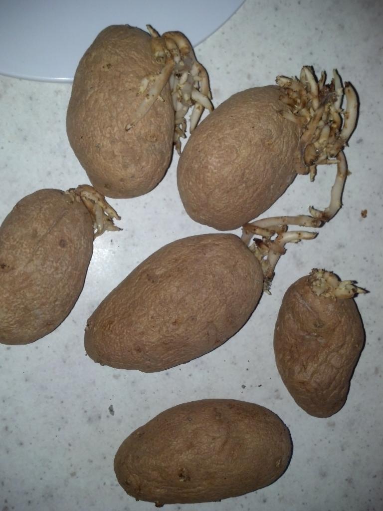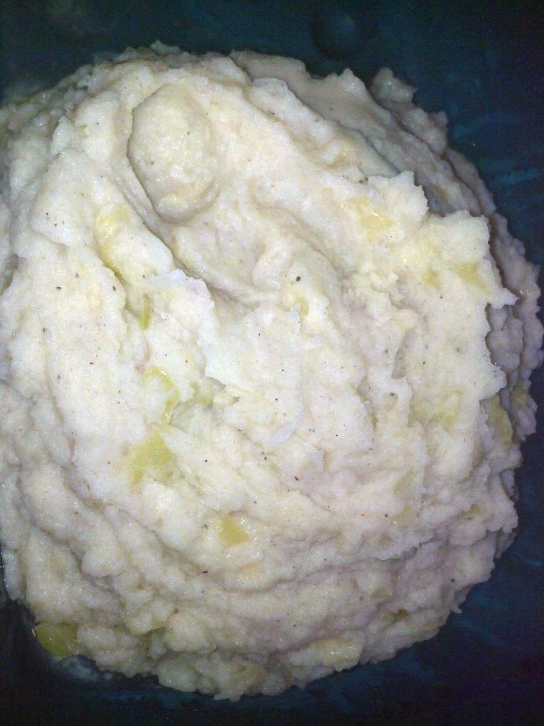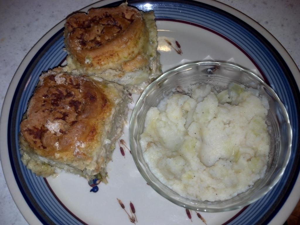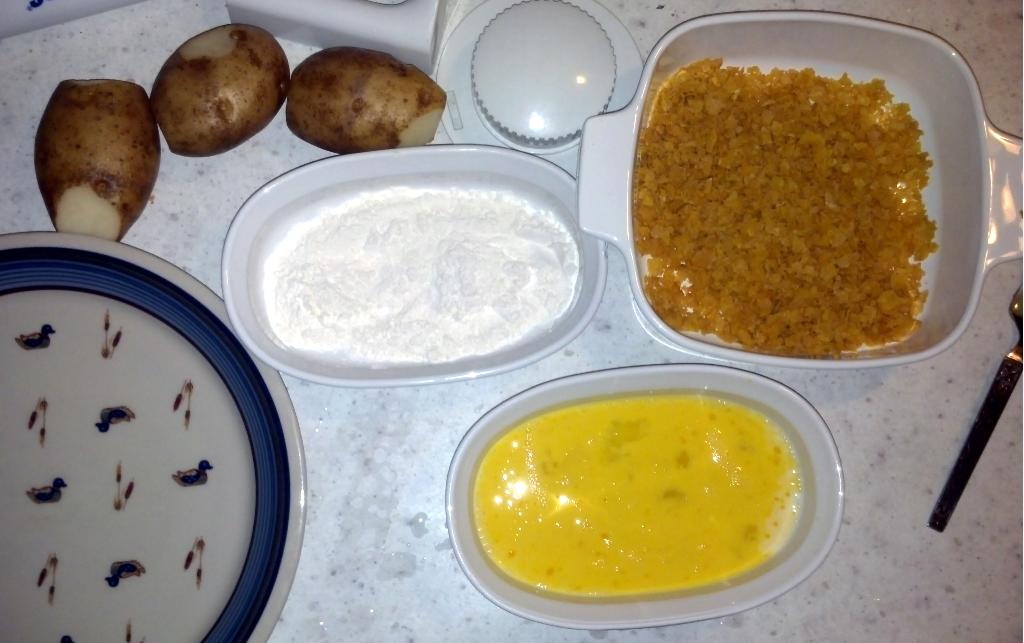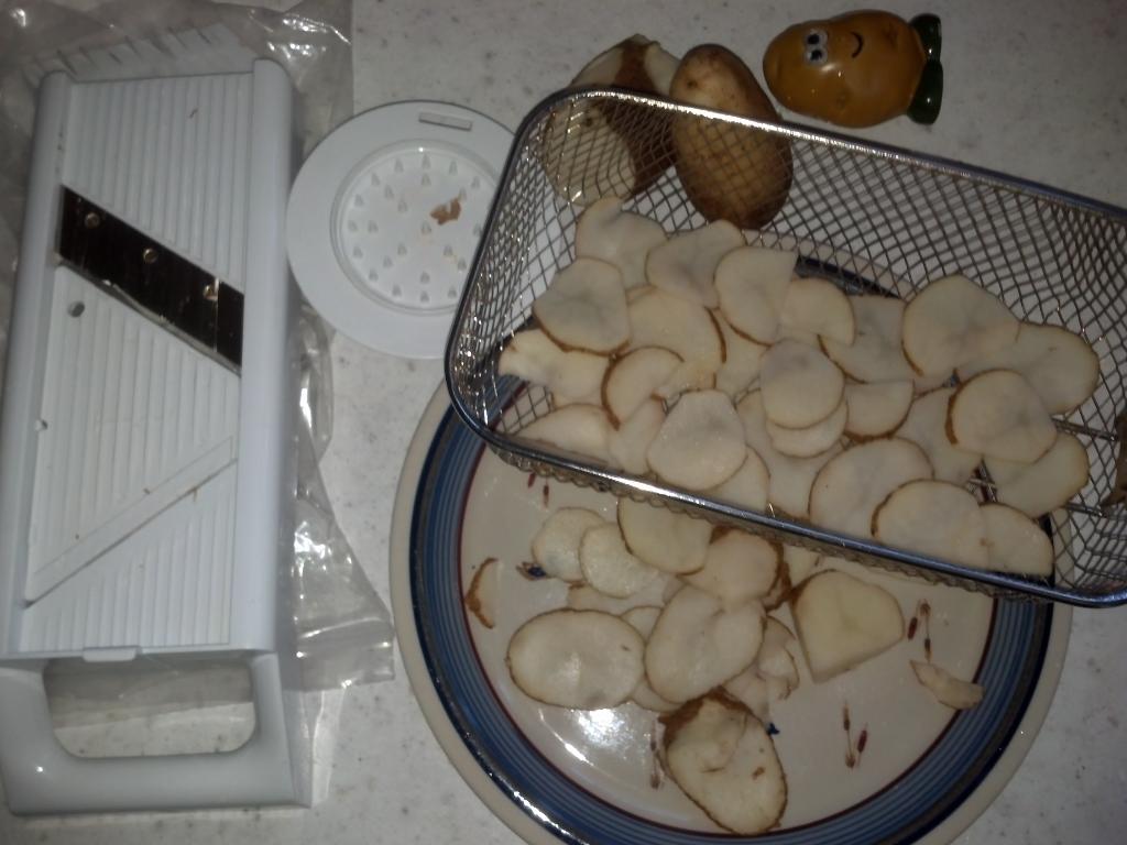 I peeled, diced, and boiled 4 small potatoes (approx 1 lb.) While the potatoes were boiling, I fried 3 chicken thighs in a pan with some oil, then boned them when they were just barely cooked, and finished cooking them through in the pan. I also cut and fried an onion.